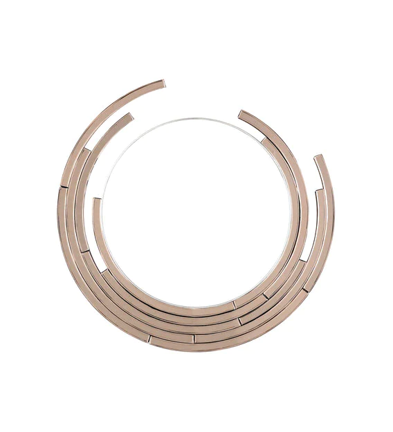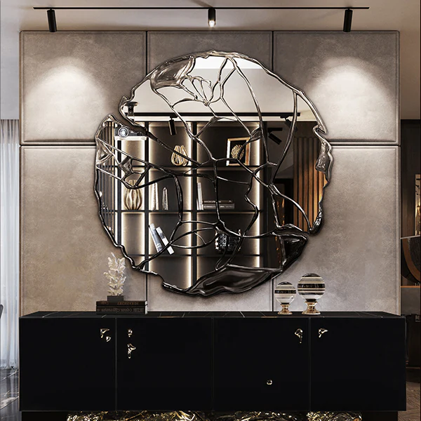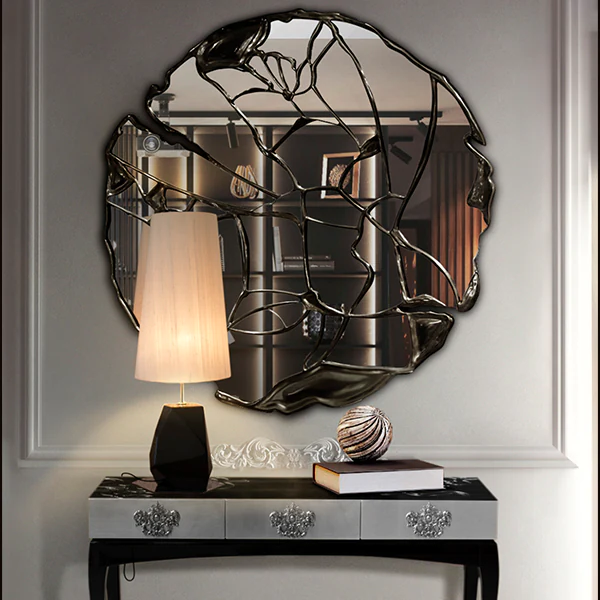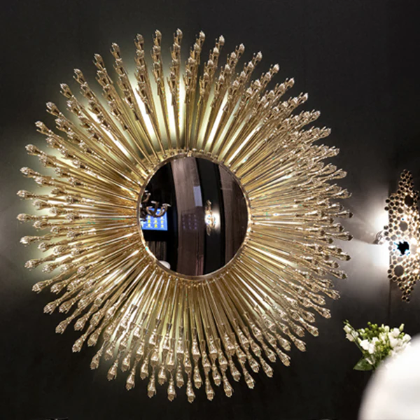 Multiple hand-crafted mirror block surrounds the outer line of the round-shaped mirror and symmetrically reflects the light to illuminate the reflection.