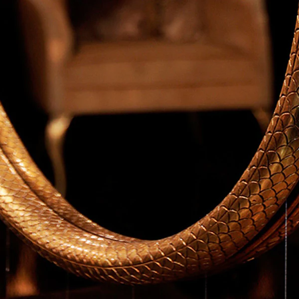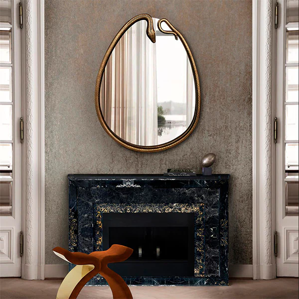 This pear-shaped mirror is framed in a coiled metal snake with a diamond black eye. This masterpiece is the ideal way to bring a touch of mysticism to any interior space.