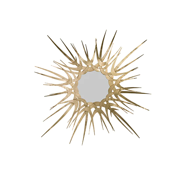 The plain flawless round-shaped mirror which is framed in a sleek golden precisely polished barn-shaped wire gives an opulent feel to the wall and elevates the overall aesthetic of a home.